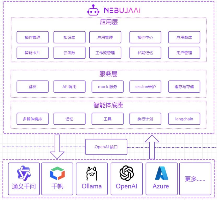NebulaAI 支持对接各种大语言模型,涵盖本地私有大模型、国内领先的公有大模型和国外知名的公有大模型等,我们提供灵活对接接口,满足企业不同业务场景的需求。